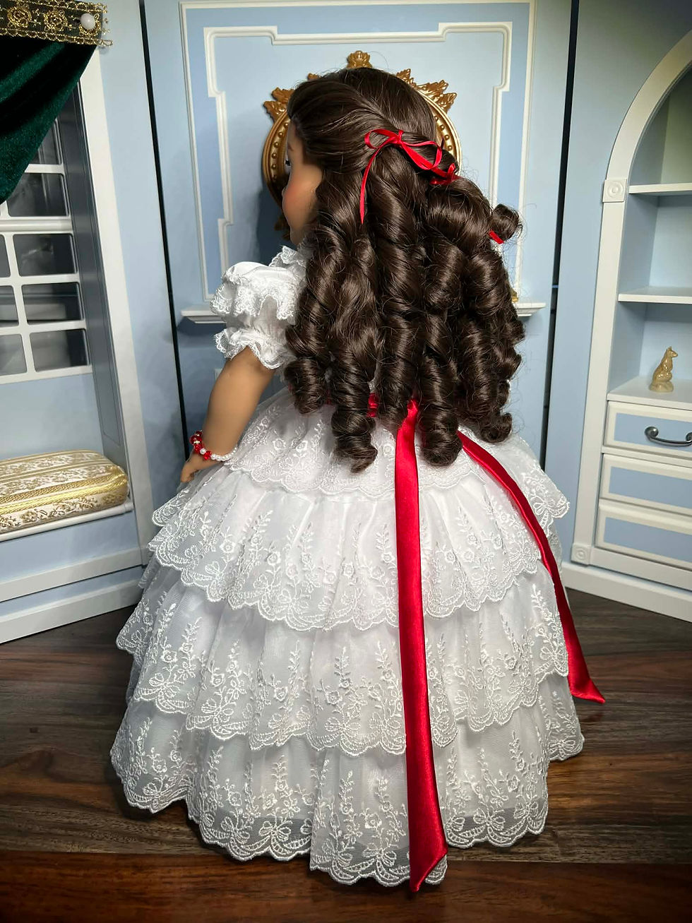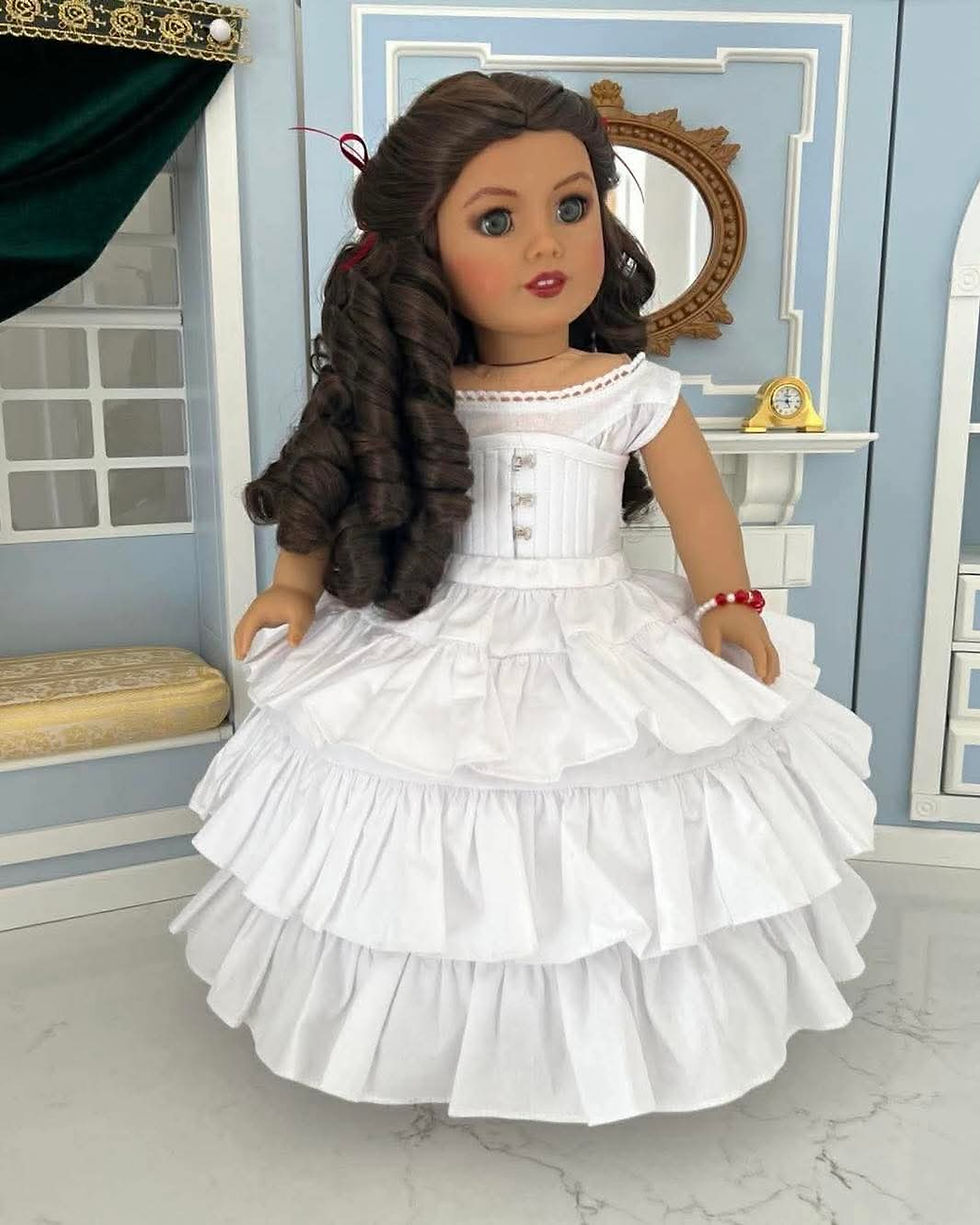 Let's first talk about my 18" custom Scarlett doll that will be modeling all the dresses in my collection. As a base doll I chose American Girl TM #101 with classic mold, gray eyes, and light-to-medium skin with warm undertones. Her face was customized by a professional doll artist - Christy Larry from Once A Doll A Dream. Her original wig was replaced with Bbeauty Doll's Cecile wig in dark brown. And finally, her ears were pierced with a large pin for human sized earrings. She is my model doll and she is not for sale, but if you're interested, I basically just provided a road map for you on how to get your own Scarlett doll!