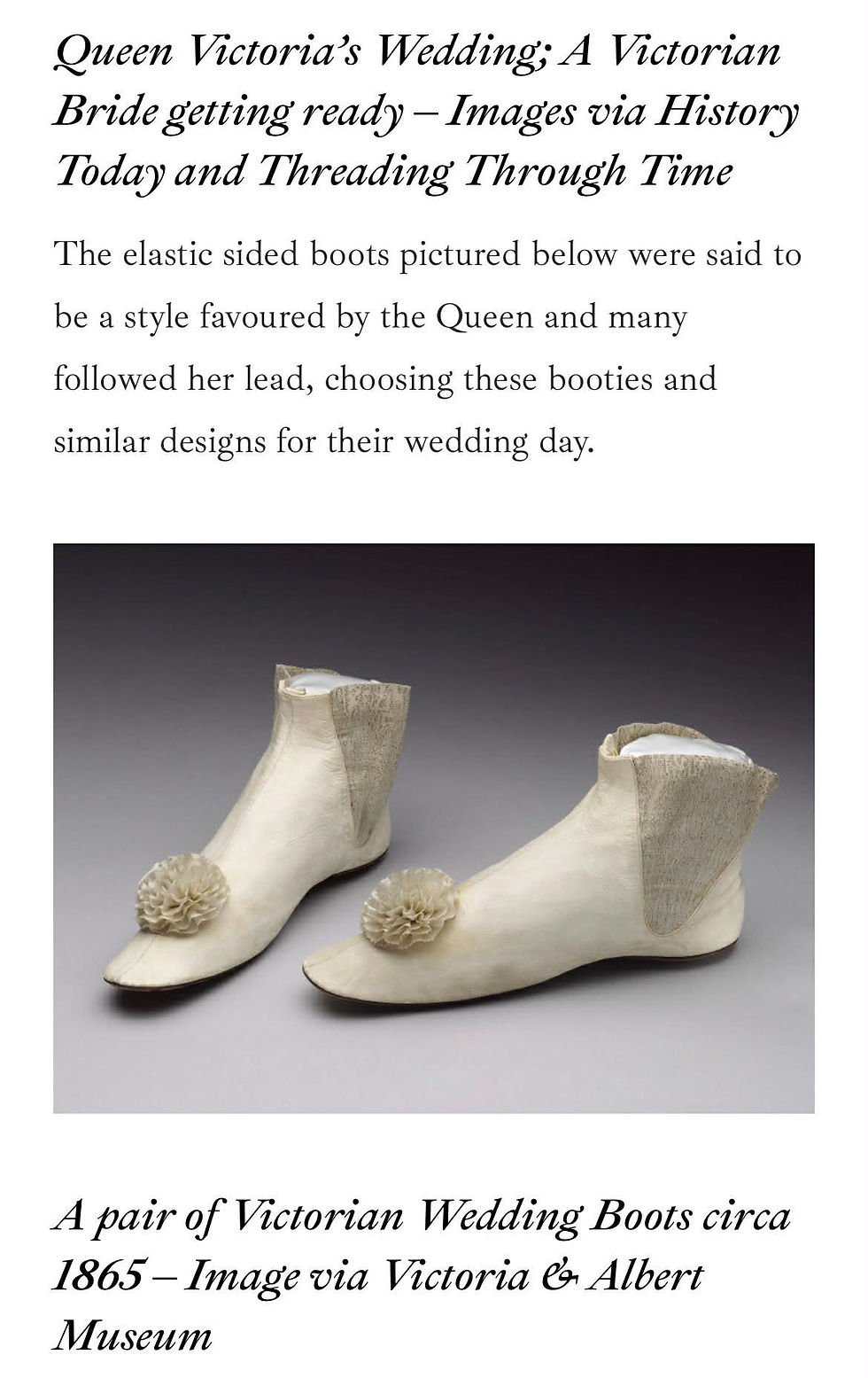 When I was doing my research on what kind of shoes Victorian brides would wear, I found some information on the style of booties that Queen Victoria wore on her wedding day.