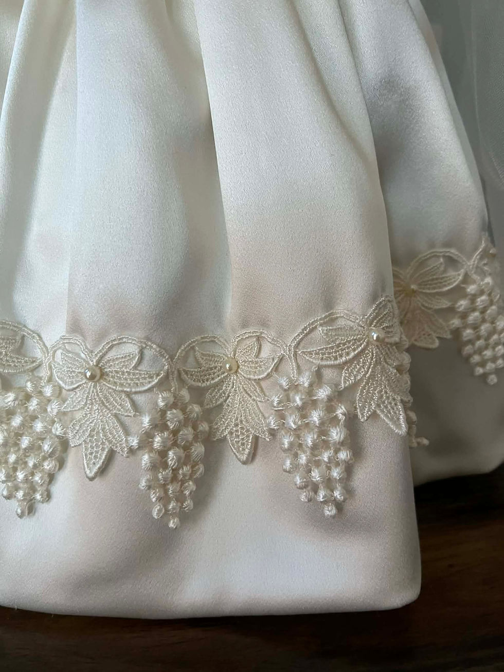 I knew exactly what pattern to use for this dress - "Molly" pattern by Pemberley Threads! So, that was a good start, but then I needed to find the right fabric and trim. I was very successful in my search; I found a beautiful medium-weight silk satin and unique embroidered Venice lace with grape leaves motif and 3-D grapes hanging. Making this dress required a lot of hand stitching, as all the trim had to be sewn to the dress by hand. I also added some pearls to the trim. The bodice and the skirt are fully lined with cotton fabric. I used buttons in the back for closure instead of snaps.